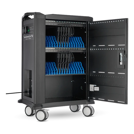 Mobile, high-capacity carts for simultaneous charging and secure storage of multiple devices.